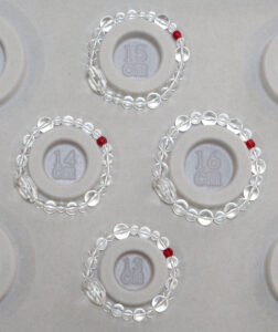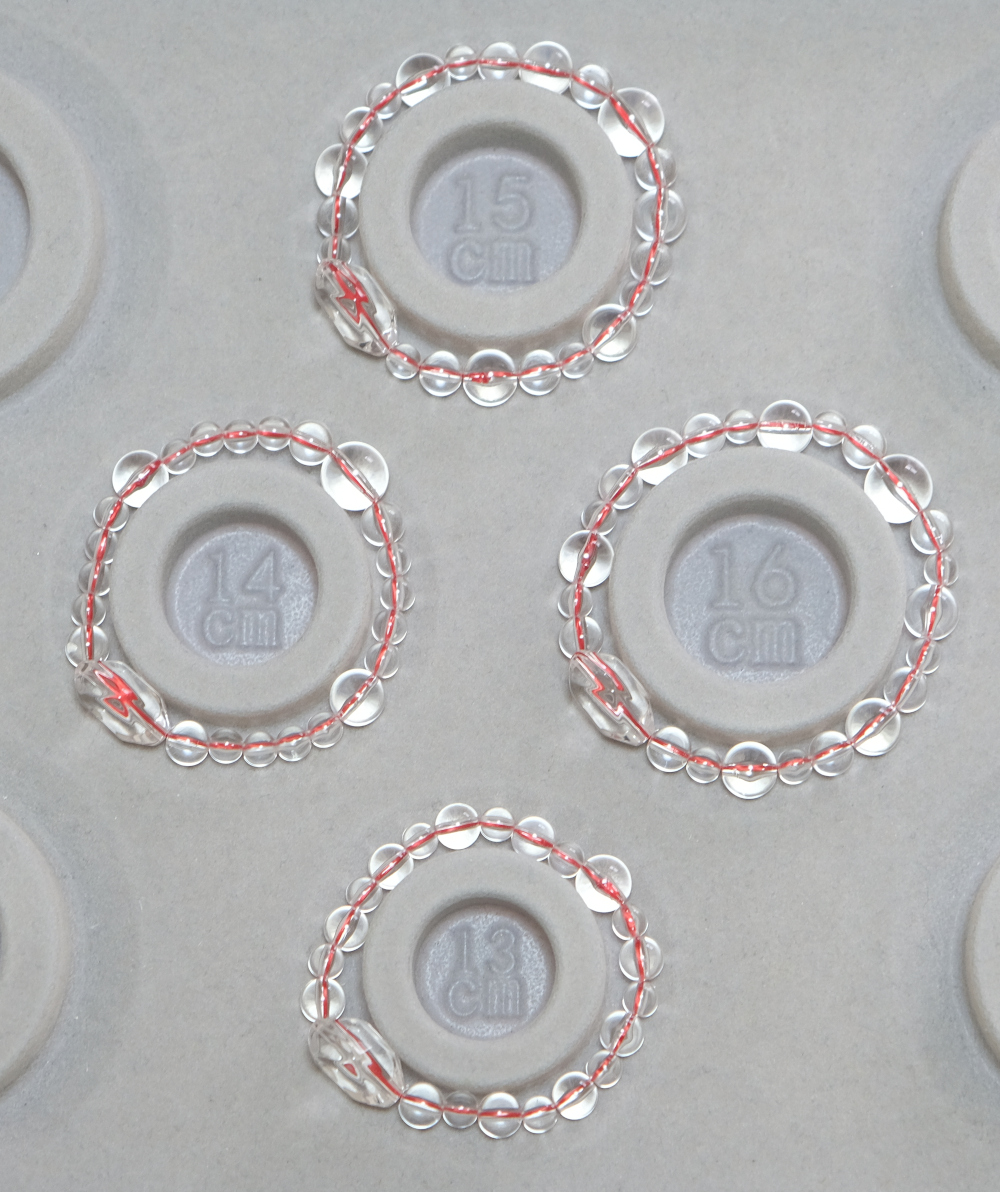 透明なリボンの赤いハートを、赤いビーズで表したデザインと、赤いゴムで表したデザインの2種類のブレスレットを4つのサイズで作りました。サイズは、約13.5センチ、約14.5センチ、約15.5センチ、約16.5センチとなっています。似ているように見えますが、デザインはすべて異なります。